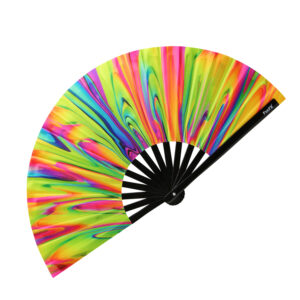 Our festival folding fans are high-quality, durable folding fan made with a sturdy Bamboo frame.  Which effortlessly flicks Open with a loud CLACK! Sound.